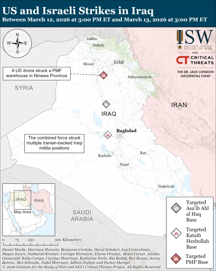 The combined force has struck additional Iraqi militia targets since CTP-ISW’s last data cutoff. Geolocated footage posted on X on March 12 shows a US drone purportedly striking a Popular Mobilization Forces (PMF) warehouse in Makhmour, Ninewa Province.[107] Multiple Iranian-backed Iraqi militias control PMF brigades that answer to Iran instead of the Iraqi prime minister.[108] A security source told Iraqi media on March 13 that an airstrike targeted a Kataib Hezbollah headquarters in Fallujah, Anbar Province.[109] Multiple airstrikes also targeted PMF positions near Tikrit, Salah al Din Province.[110] A security source told Iraqi media that the strike hit an Asaib Ahl al Haq headquarters.[111]