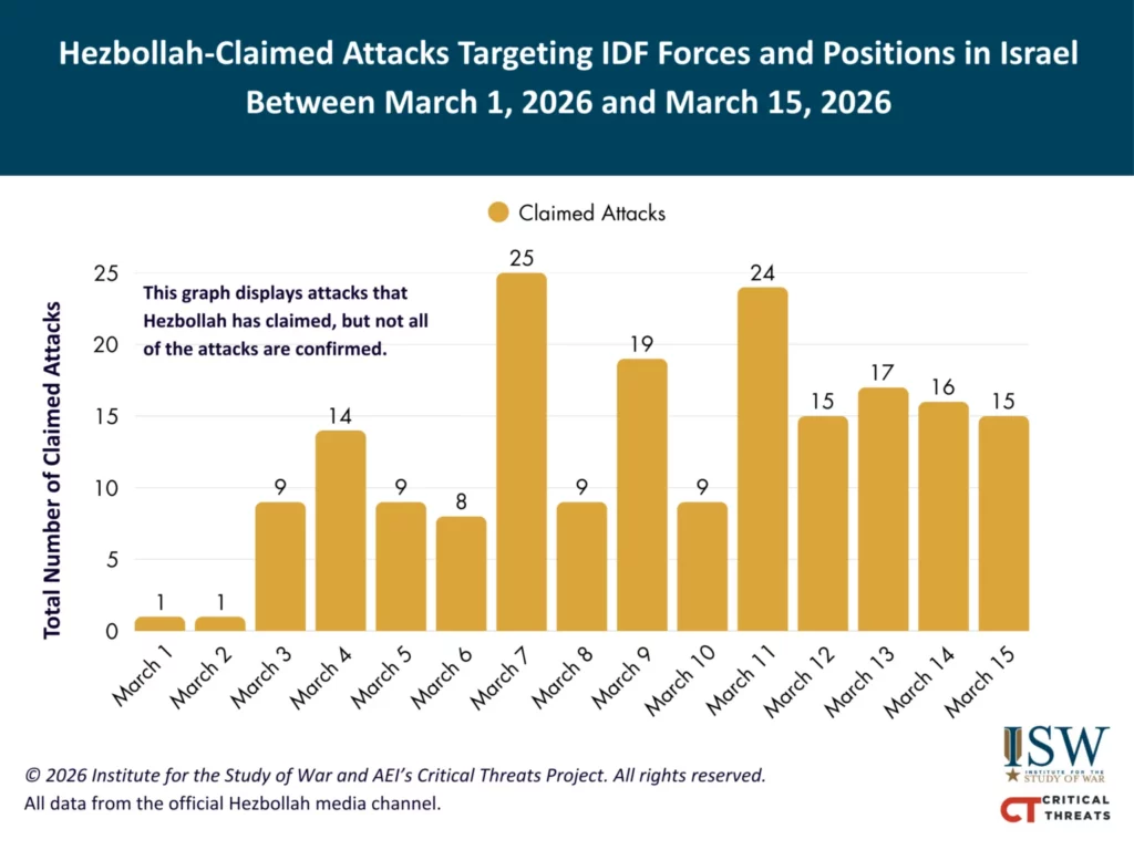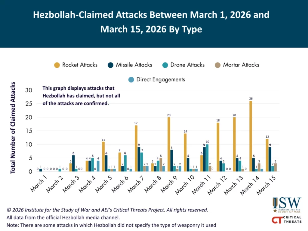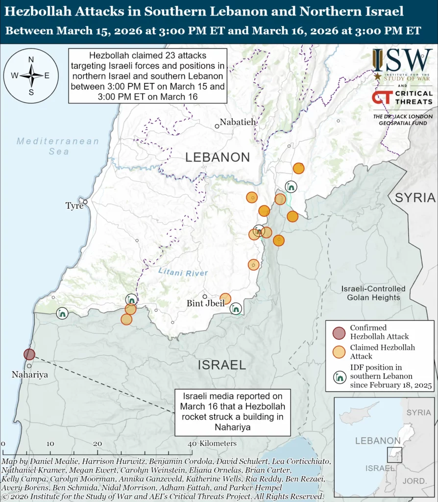 Hezbollah claimed 23 attacks targeting Israeli forces and positions in northern Israel and southern Lebanon between 3:00 PM ET on March 15 and 3:00 PM ET on March 16.[75] Hezbollah claimed several rocket and drone attacks targeting IDF positions and forces along both sides of the Israel-Lebanon border.[76] Hezbollah claimed that it launched a rocket barrage and a “squadron” of drones targeting the town of Nahariya in northern Israel on March 16.[77] Israeli media and an Israeli journalist reported on March 16 that a Hezbollah rocket directly impacted a structure in Nahariya.[78]
