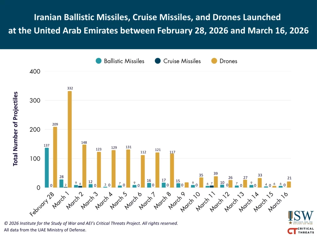 The Gulf states continued to intercept the bulk of Iran’s missile and drone attacks. Bahrain Defense Forces said it detected and intercepted three Iranian drones and four Iranian missiles on March 16 as of 3:00 PM ET.[65] The Kuwaiti Army reported that its air defense system detected four Iranian drones, one of which was intercepted, one fell outside the ”threat zone,” and two fell in the north.[66] The Qatari Defense Ministry reported that it intercepted several Iranian drones and intercepted 13 Iranian ballistic missiles with one missile falling in open areas.[67] Saudi Defense Ministry reported that it detected and intercepted 43 Iranian drones on March 16 as of 3:00 PM ET.[68] The Emirati Defense Ministry reported that it detected and intercepted 21 Iranian drones and six Iranian missiles on March 16.[69] Iranian drone attacks targeting the UAE have relatively increased compared to March 15, as illustrated below.