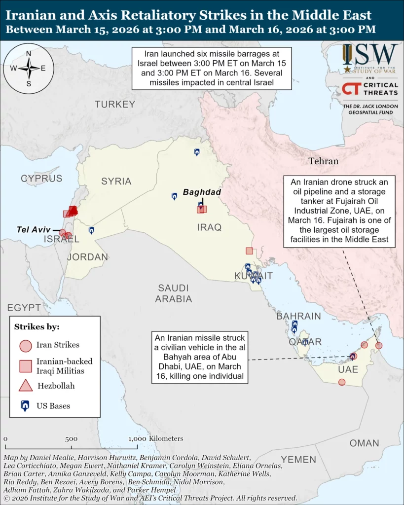 Iran continued to fire at the Gulf states on March 15 and 16, but Gulf air defense systems have continued to intercept most Iranian projectiles. CTP-ISW observed four impacts in the Gulf states between 3:00 PM ET on March 15 and 3:00 PM ET on March 16. An Iranian drone struck the Dubai International Airport, United Arab Emirates (UAE), on March 15, causing a fire at a nearby fuel tank.[58] Another Iranian drone struck a storage tanker and an oil pipeline at Fujairah Oil Industrial Zone, UAE, on March 16.[59] Fujairah is one of the largest oil storage facilities in the Middle East and the pipelines that flow to Fujairah enable oil shipments to bypass the Strait of Hormuz.[60] An Iranian missile struck a civilian vehicle in the al Bahyah area of Abu Dhabi, Saudi Arabia, on March 16, killing one individual.[61] An Iranian drone struck the Shah oil field in Abu Dhabi, UAE, on March 16, causing a fire.[62] The Shah field is home to the world’s largest ultra-sour gas operations, which involve using high hydrogen sulfide concentrates to remove impurities so that the gas can be used for electricity production or fuel gas in refineries.[63] Iran has undertaken an effort to impose political pressure on the United States by striking oil infrastructure in the region and oil tankers in the Strait of Hormuz.[64]