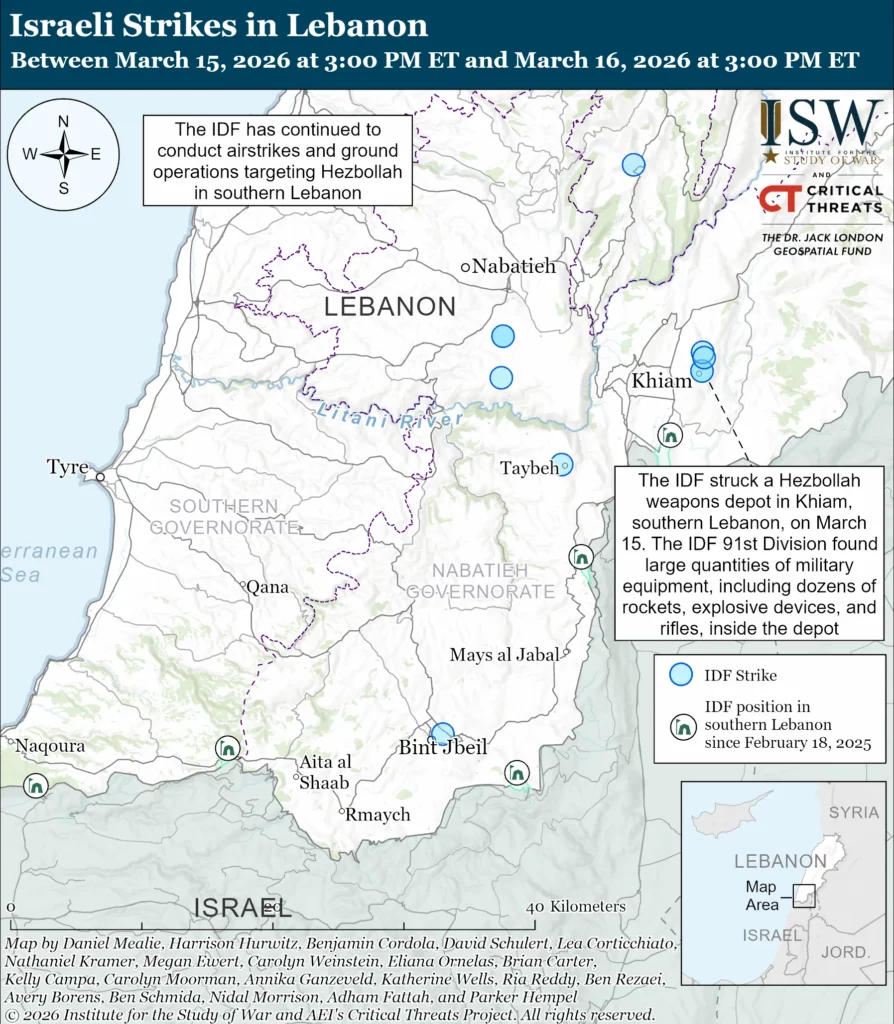 The Israel Defense Forces (IDF) has continued to conduct airstrikes and ground operations targeting Hezbollah in southern Lebanon. The IDF struck a Hezbollah weapons depot in Khiam, southern Lebanon, on March 15.[79] IDF ground forces had previously discovered the depot.[80] The IDF 91st Division previously found large quantities of combat equipment, including dozens of rockets, explosive devices, and rifles, inside the depot.[81] The IDF 401st Armored Brigade (162nd Division) also destroyed a weapons depot and discovered Hezbollah weapons in southern Lebanon on March 16.[82]