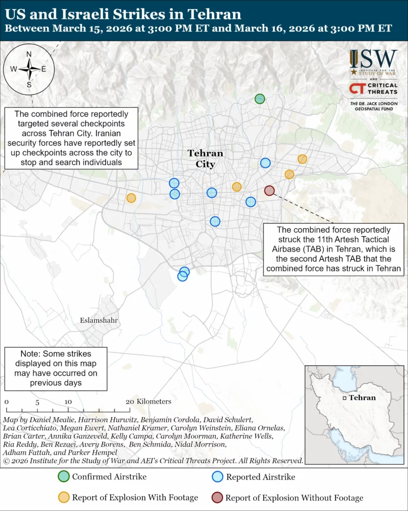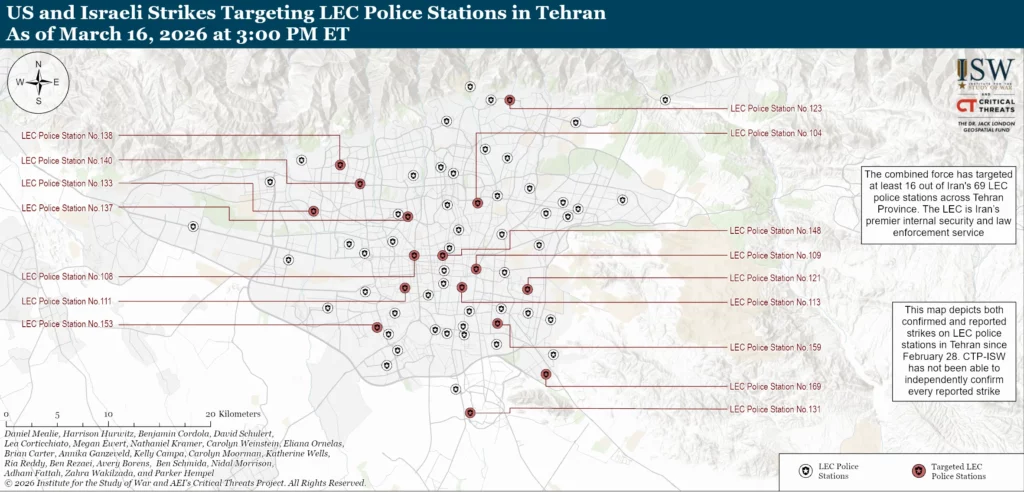 The combined force struck several internal security sites in Tehran. Anti-regime media reported on March 16 that the combined force struck six security force checkpoints across Tehran, including checkpoints in places where large gatherings could occur, such as Enghelab Square.[31] Anti-regime media separately reported on March 16 that the combined force struck a Basij base in northern Tehran.[32] OSINT accounts on X reported on March 16 that the combined force struck several Basij buildings in eastern Tehran.[33] The IDF said on March 16 that it struck an unspecified Iranian intelligence command center in central Tehran.[34] The combined force continued to strike LEC stations in Tehran. Anti-regime media reported on March 16 that the combined force struck the 123rd LEC station in Niavaran District, Tehran.[35] ISW-CTP has recorded combined force strikes against 16 of Tehran’s 69 LEC stations at the time of this writing.[36]