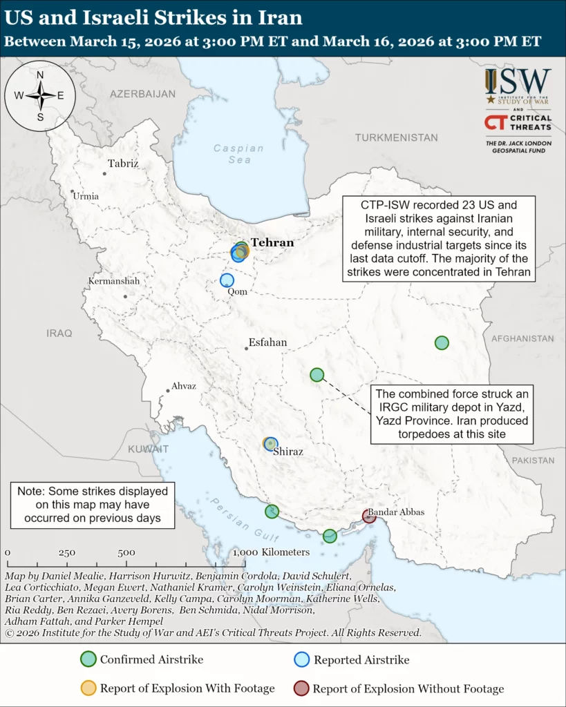 The Iranian regime has taken steps to further restrict the flow of information out of Iran, which will almost certainly limit ISW-CTP’s ability to observe strikes in Iran.[24] The regime has maintained a nationwide internet shutdown since the war started on February 28.[25] A BBC reporter stated on March 15 that the regime has reportedly started to target individuals with Starlink access and reduced the availability of VPNs.[26] The regime targeted Starlink devices during the Winter 2026 protests to prevent Iranians from circulating videos of protests and the regime’s brutal crackdown.[27] Internet monitor NetBlocks reported on March 16 that the regime has further tightened internet restrictions.[28] NetBlocks founder Alp Toker noted that Iranian state media accounts that usually post frequently on X abruptly stopped posting at 0700 AM ET, which coincided with a collapse in connectivity.[29] Iran’s worsening internet conditions coincide with other regime securitization measures. Residents of Tehran told the BBC that Iranian security forces have established new checkpoints across the city to stop and search individuals.[30] The regime has taken these steps to tighten internal security, at least in part, because it fears potential future unrest.