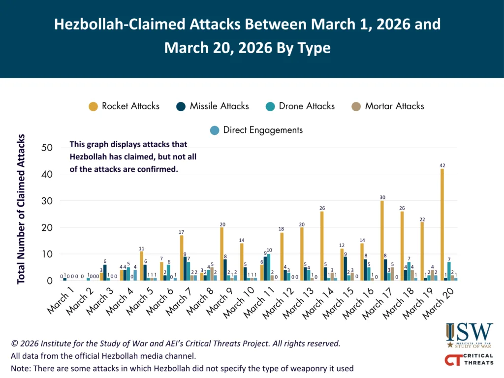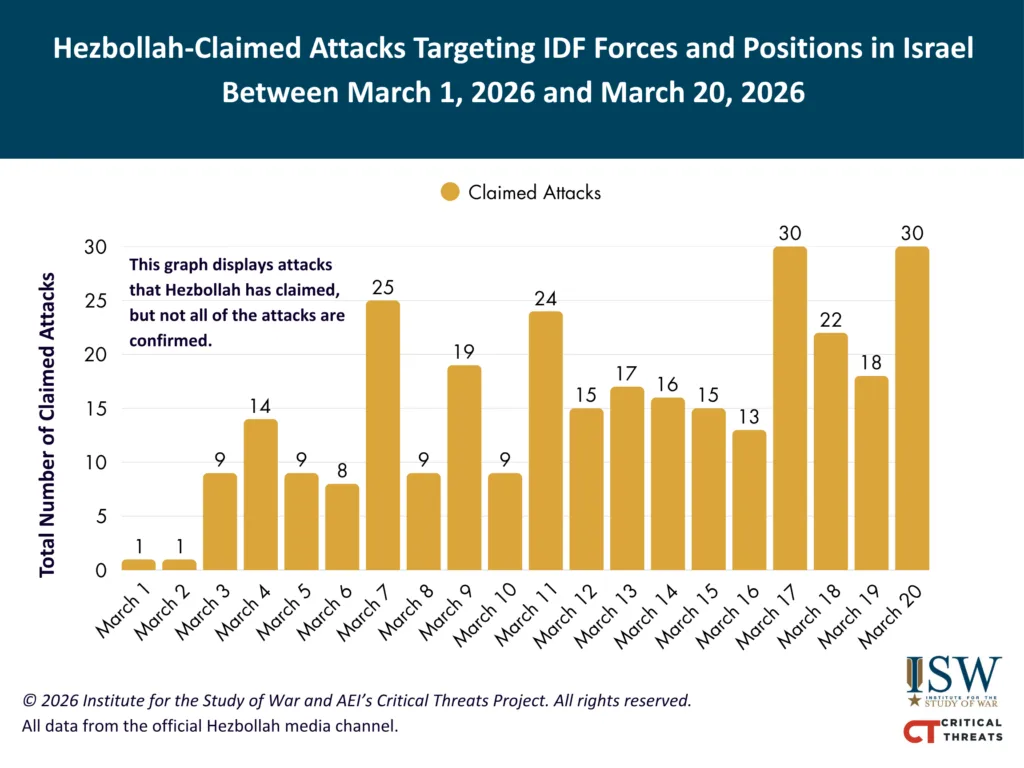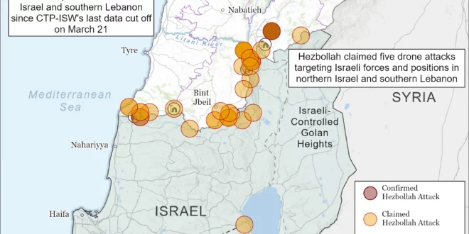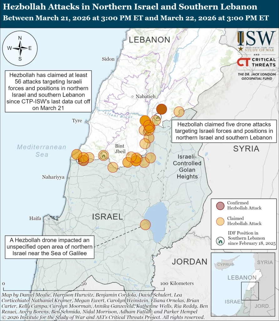Hezbollah claimed 56 attacks targeting Israeli forces and positions in northern Israel and southern Lebanon, as well as northern Israeli towns, between 3:00 PM ET on March 21 and 3:00 PM ET on March 22.[68] Most of Hezbollah’s claimed attacks targeted Israeli forces and military sites with rockets.[69] Hezbollah claimed six drone attacks targeting Israeli forces and positions in northern Israel and southern Lebanon.[70] Israeli sources reported multiple instances of sirens in northern Israel on March 21 and 22 in response to Hezbollah drone attacks.[71] A Hezbollah drone landed in an open area of northern Israel near the Sea of Galilee on March 22, according to an Israeli correspondent.[72] Hezbollah claimed three rocket attacks targeting northern Israeli towns on March 22.[73] Hezbollah is likely continuing to attempt to displace northern Israeli residents from their homes by targeting northern Israeli towns in order to increase political pressure on the Israeli government to halt its war effort against Iran.