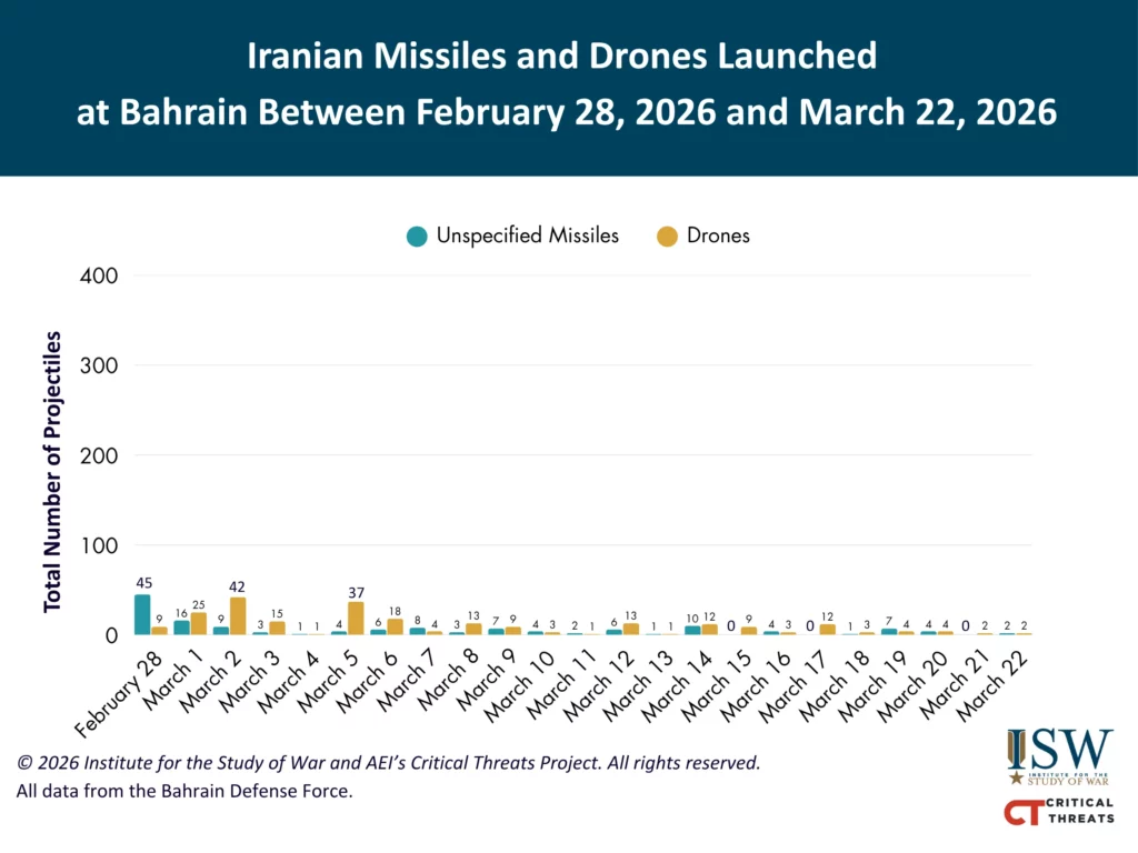 The Bahrain Defense Force said that it has intercepted two drones and two ballistic missiles since ISW-CTP’s last data cut off.[60] The IRGC claimed to target the US Fifth Fleet base in Manama, Bahrain, on March 22.[61]