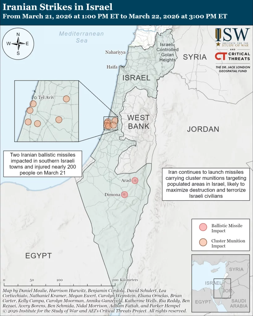 Iran continues to launch missiles carrying cluster munitions targeting populated areas in Israel, likely to maximize destruction and terrorize Israeli civilians. A cluster munition warhead contains submunitions that disperse over a wide area. Cluster munitions are significantly more difficult for Israeli air defenses to intercept once dispersed. Iran launched at least three missiles carrying cluster munitions targeting Israel on March 22 that impacted across the Tel Aviv area, including in Jaffa, Petah Tikva, Bat Yam, and Holon.[54] Iran likely began using cluster warheads to maximize the damage inflicted by its ballistic missiles given their relatively low accuracy when fitted with standard warheads.[55] Around 70 percent of Iranian missile launches at Israel have reportedly carried cluster munitions.[56] An Israeli military correspondent reported that at least two dozen missiles with warheads have released cluster munitions over populated areas throughout the war.[57] The correspondent noted that there have been over 100 separate impact sites from cluster munitions.[58]
