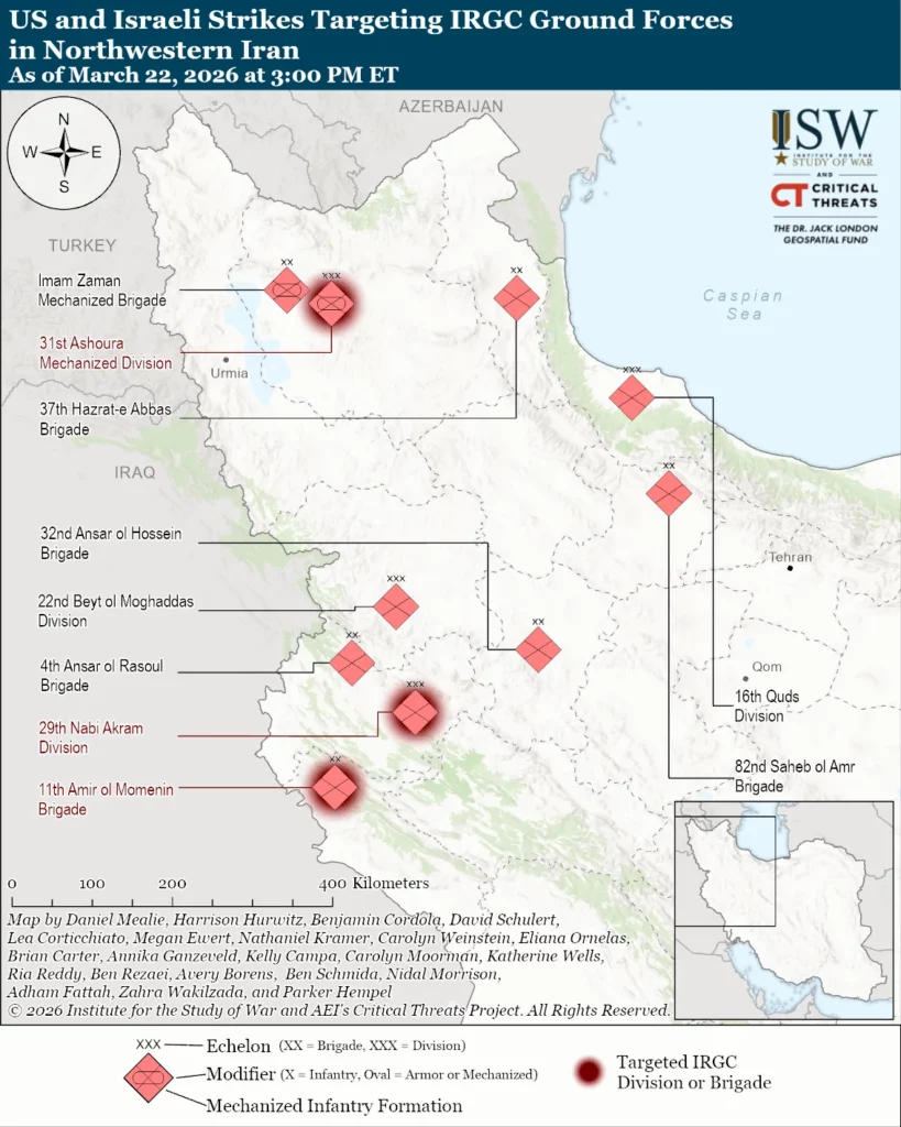 IRGC Ground Forces Commander Brigadier General Mohammad Karami visited unspecified IRGC Ground Forces units in western and northwestern Iran on March 22.[10] The combined force has struck several Ground Forces units in these areas since the beginning of the war. Iranian Armed Forces General Staff (AFGS)-affiliated media reported that Karami warned that Ground Forces units are ready to confront any ”aggressors” on Iran’s borders.[11] The IRGC Ground Forces are structured to confront any invading force while also having units positioned to violently suppress social unrest.[12] The visit of the IRGC Ground Forces commander to units in northwestern provinces along Iran’s border is notable given the combined force’s efforts to degrade internal security institutions in Iran’s western border region and reports about possible armed Kurdish mobilization along the Iran-Iraq border.[13] The combined force has reportedly struck at least two IRGC Ground Forces divisions and one brigade in northwestern and majority Kurdish areas of Iran since February 28 (see map below).[14] The combined force reportedly struck the 31st Ashoura Mechanized Division, which operates in Tabriz, East Azerbaijan Province, on March 4. Commercially available satellite imagery from March 4 and 5 also confirmed damage from combined force strikes to the 11th Amir ol Momenin Brigade base in Soltan Abad, Ilam Province, and the Nabi Akram Operational Division in Kermanshah City, Kermanshah Province.[15]