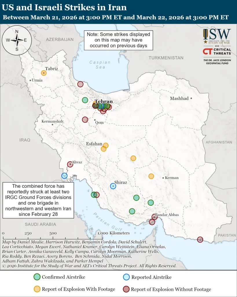 The IDF continued to strike internal security institutions and personnel in Tehran on March 22. The IDF reported that it struck an “additional headquarters” belonging to Iranian Intelligence and Security Ministry in Tehran.[35] The IDF has pursued other Intelligence and Security Ministry-affiliated targets since the beginning of the war, including headquarters, personnel, and other assets across Iran.[36] The IDF recently killed Intelligence and Security Minister Esmail Khatib in an airstrike on March 18.[37] The IDF also struck an ”emergency command center” for internal security forces in Tehran on March 22.[38] The reference to an ”emergency command center” may refer to improvised facilities necessitated by Israeli strikes on the regular headquarters of the security units. ISW-CTP recently noted that fear and shock have caused some Iranian internal security personnel to abandon established headquarters and bases, set up improvised facilities, and adapt command-and-control structures under pressure.[39]