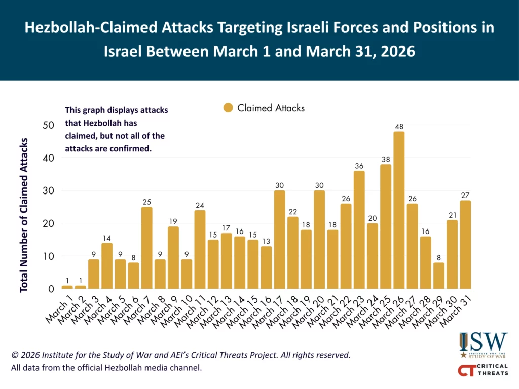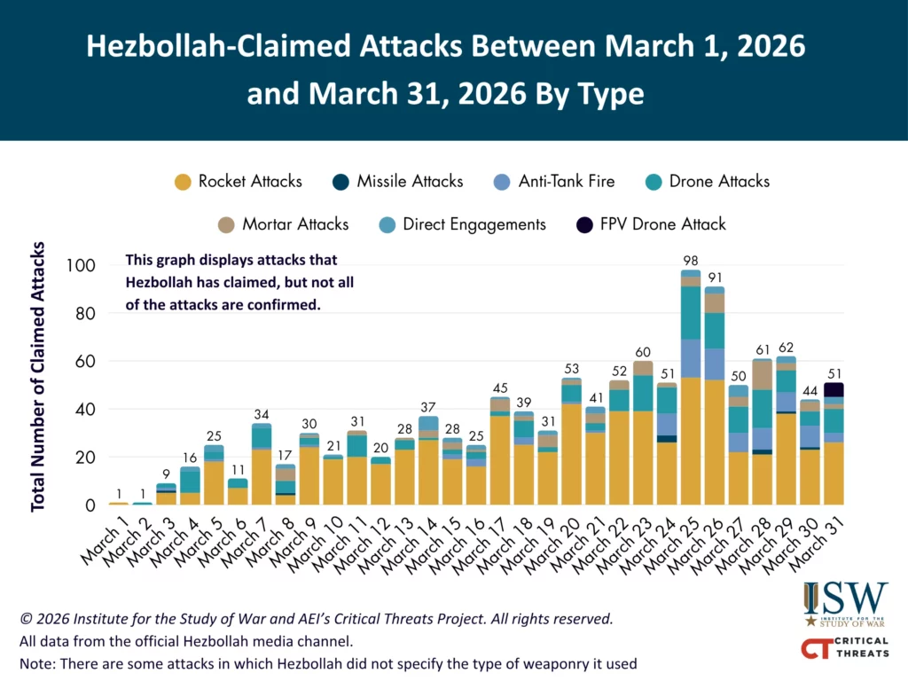 Hezbollah claimed that it conducted 71 attacks targeting northern Israeli communities and Israeli forces and positions in northern Israel and southern Lebanon between 2:00 PM ET on March 31 and 2:00 PM ET on April 1.