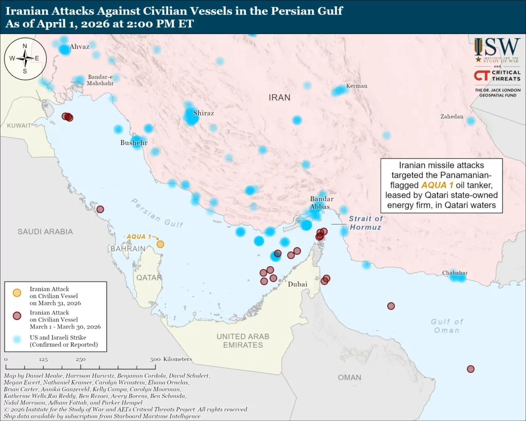 Iran has continued attacks on shipping amid discussions in Tehran about Iran’s leverage over the strait. Iran attacked the Panamanian-flagged AQUA 1 oil tanker, leased by Qatari state-owned energy firm, 17 nautical miles northwest of Ras Laffan, Qatar.
