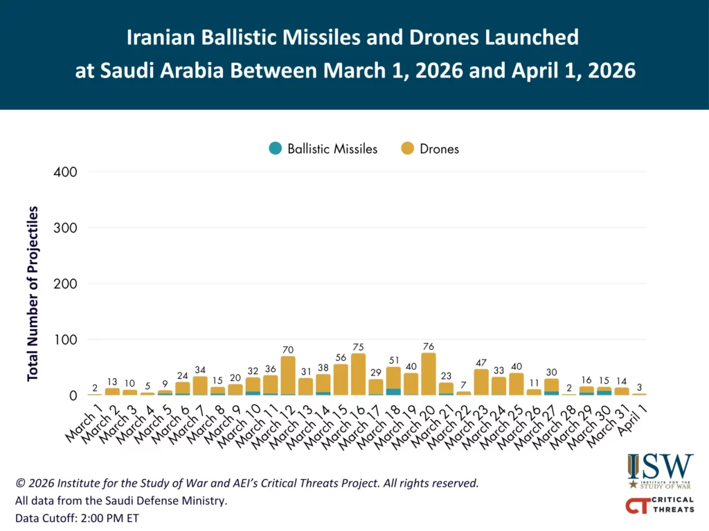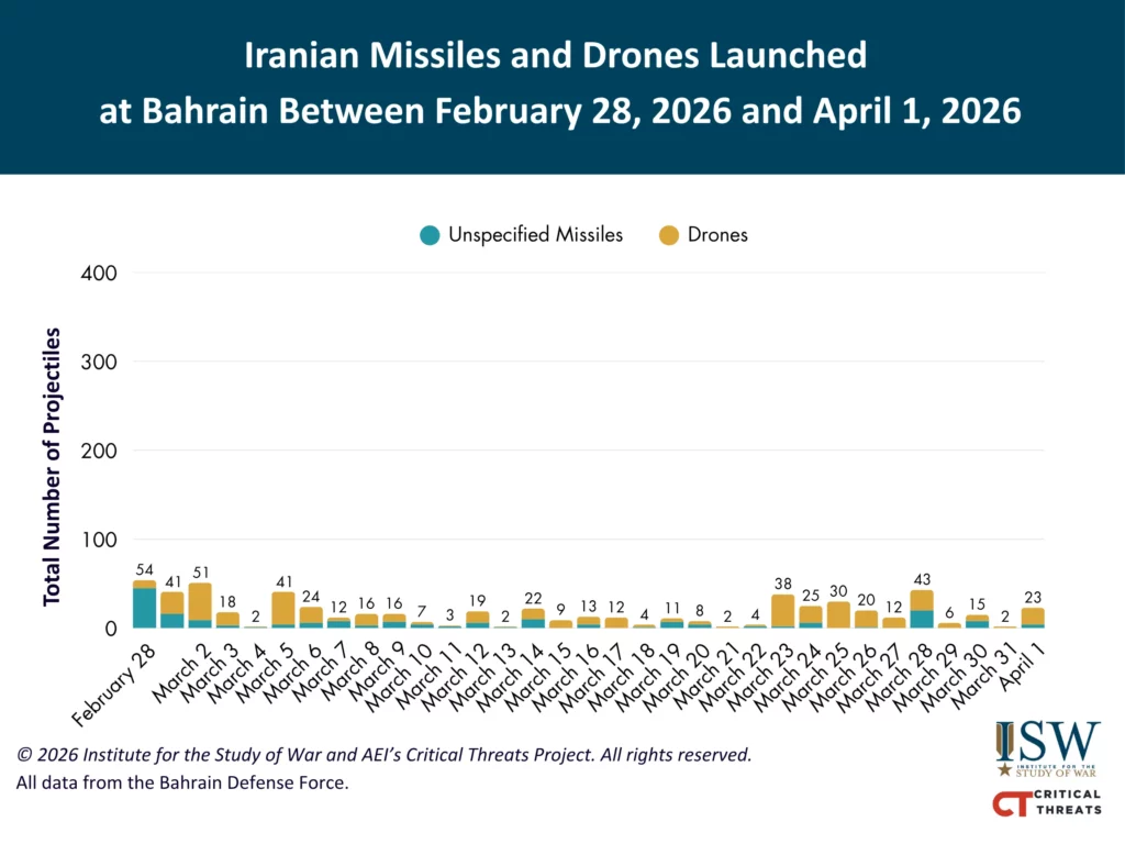 Iran continues to conduct drone and missile attacks against the Gulf states. The Bahrain Defense Forces reported on April 1 that it intercepted 19 drones and four ballistic missiles.[49] The Bahraini Interior Ministry reported that one of these Iranian attacks struck an unspecified company building but caused no casualties.[50] Unconfirmed reports circulating on social media suggested that the targeted building was the Bahrain Telecommunication Company (Batelco) headquarters in Hamala, Bahrain, but the Bahraini Interior Ministry only said that one attack struck an unspecified company building.[51] The incident follows an IRGC threat on March 31 that it would target US‑linked information, communications, artificial intelligence, and advanced technology firms in retaliation for US and Israeli attacks.[52] Iran has previously targeted data centers in the Gulf states, including an Amazon Web Services data center in the UAE.[53]