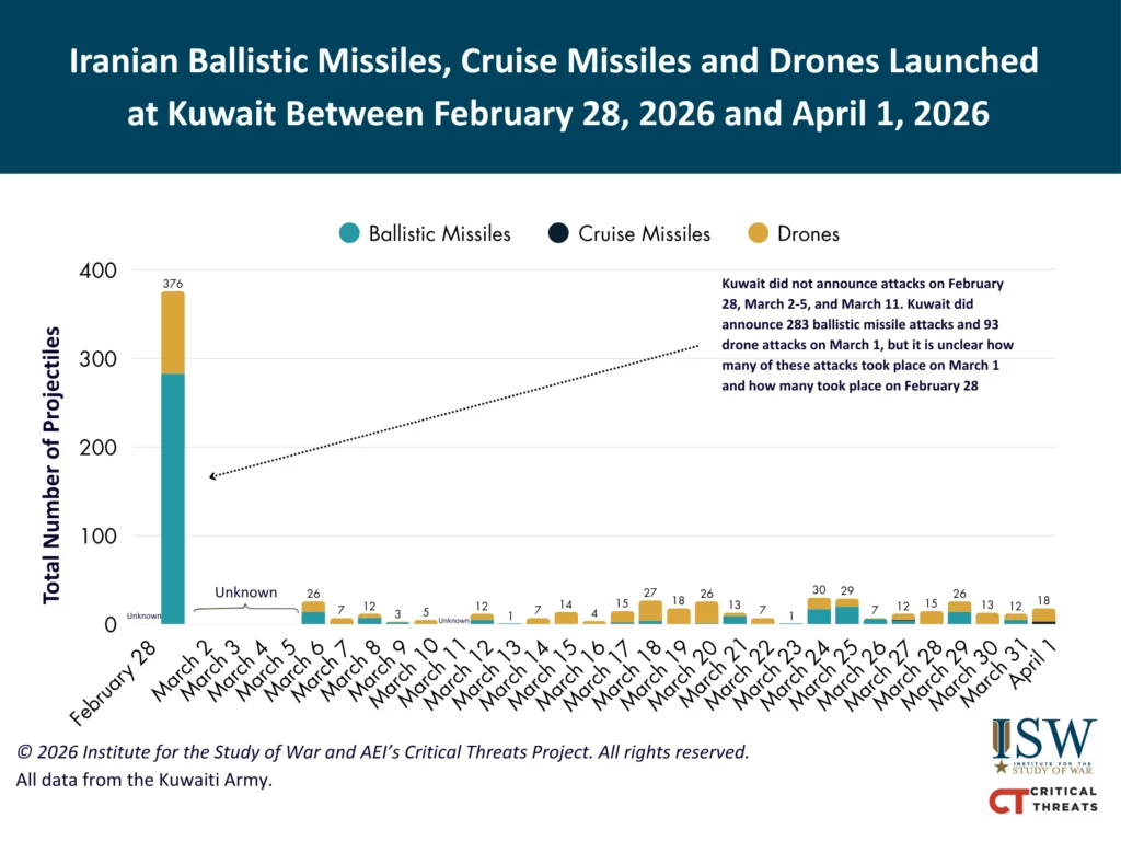 The Kuwaiti Armed Forces also reported that it detected three Iranian cruise missiles and 15 drones in Kuwaiti airspace on April 1.[57] Kuwait media also reported that an Iranian drone struck fuel tanks at the Kuwait International Airport on March 31, causing significant damage but no casualties.[58]