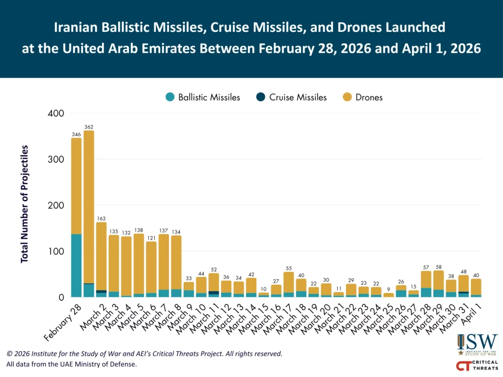 The Emirati Defense Ministry reported that it intercepted 35 drones and five ballistic missiles on April 1.[54]