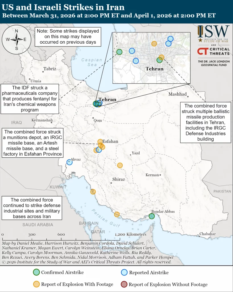 The combined force continued to strike Iran’s defense industrial sites. The IDF stated on April 1 that it struck “approximately 15 weapons production sites,” including a Ministry of Defense and Armed Forces Logistics (MODAFL) complex.[22] The complex contained infrastructure for the development of advanced ballistic missiles.[23] MODAFL is responsible for the research and development of Iran’s missile and nuclear weapons programs and is sanctioned by the United States.[24] An OSINT account on X reported on March 31 that the combined force struck an IRGC Defense Industries building in Tehran.[25] The combined force also struck three major Iranian steel factories on March 31: Sefid Dasht industrial zone in Boroujen, Charmahal and Bakhtiari Province, the Khuzestan Steel Company in Ahvaz, Khuzestan Province, and the Mobarakeh Steel Company in Mobarakeh, Esfahan Province.[26] The IDF previously struck the Mobarakeh Steel Company and Khuzestan Steel Company on March 27.[27] Strikes on Iran’s steel factories hurt both its military and economy by degrading its ability to build ballistic missiles and reducing one of Iran’s most important exports.[28]