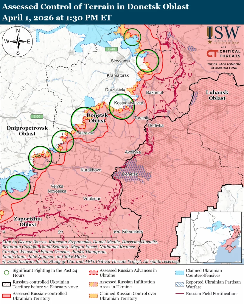 Russian forces attacked near Kostyantynivka itself; south of Kostyantynivka near Ivanopillya, Illinivka, and Pleshchiivka; southwest of Kostyantynivka near Stepanivka and Yablunivka; south of Druzhkivka near Rusyn Yar and toward Mykolaipillya; and southwest of Druzhkivka near Novopavlivka and Sofiivka on March 31 and April 1.[70]