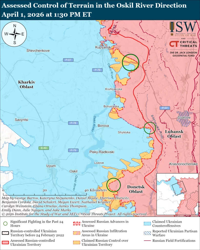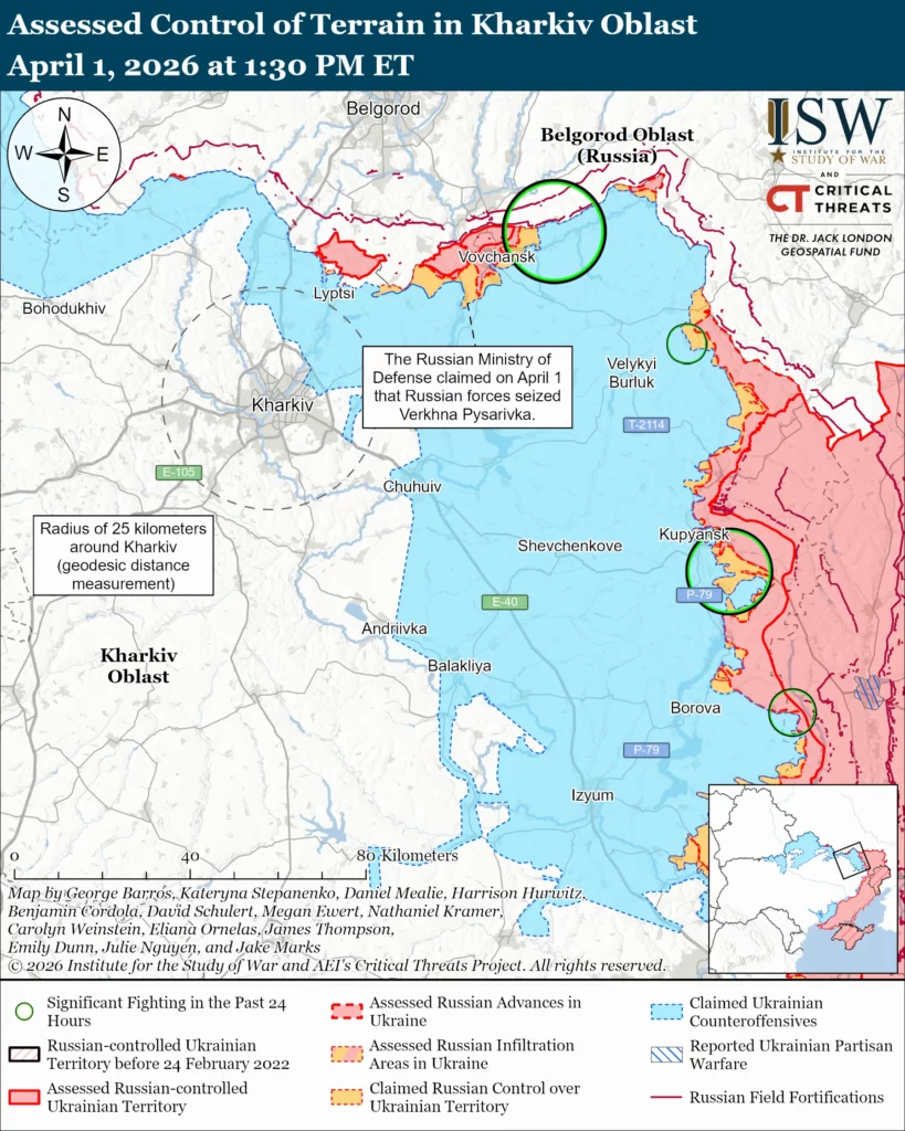 Russian forces continued offensive operations in the Velykyi Burluk direction on April 1 but did not make confirmed advances.
