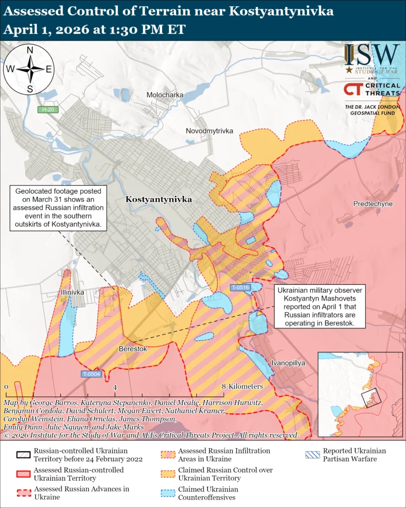 Assessed Russian infiltrations: Geolocated footage published on March 31 shows Ukrainian forces striking a Russian position in southeastern Kostyantynivka after what ISW assesses was a Russian infiltration mission that did not change the control of terrain or the FEBA.[68] Ukrainian military observer Kostyantyn Mashovets reported on April 1 that Russian forces advanced into Berestok.[69]