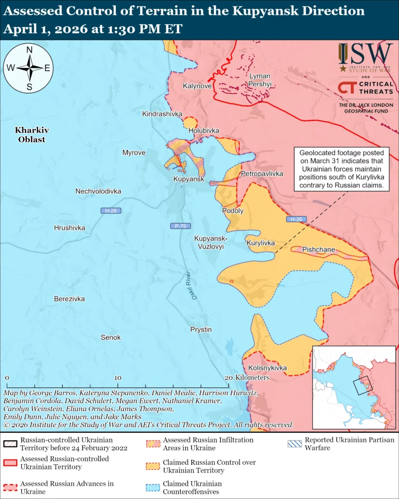 Assessed Russian infiltrations: Geolocated footage published on April 1 shows a Russian servicemember raising a flag in Boikove (southwest of Oleksandrivka) during what ISW assesses was a Russian infiltration mission that did not change control of terrain or the forward edge of battle area (FEBA).[89] ISW continues to assess that Russian flag raising tactics are part of a cognitive warfare effort to make aggrandized claims of Russian advances and to spread the false narrative that Ukrainian defenses are collapsing across the theater.[90]