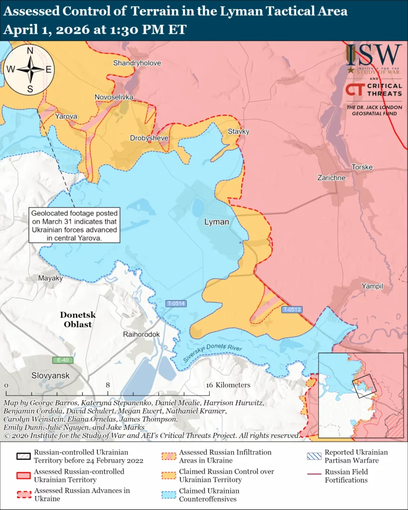 Assessed Russian infiltrations: The geolocated footage published on March 31 shows Ukrainian forces striking a Russian position in Yarova and then clearing the position after ISW assesses was a Russian infiltration mission that did not change control of terrain or the forward edge of the battle area (FEBA) at this time.[61]
