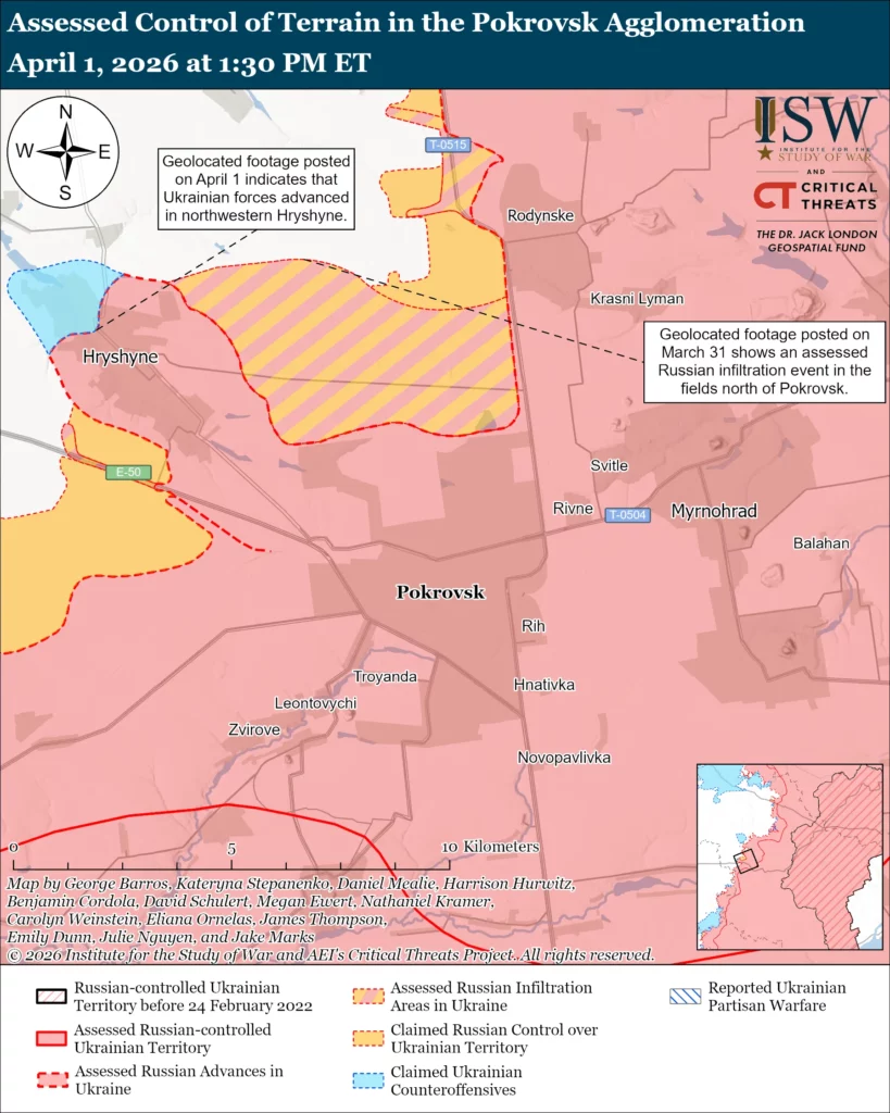 Assessed Russian infiltrations: Geolocated footage published on March 31 shows Ukrainian forces striking a Russian position north of Pokrovsk after what ISW assesses was a Russian infiltration mission that did not change the control of terrain or the FEBA.[81]