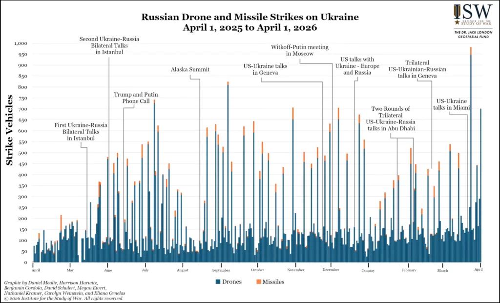 Russian forces conducted another prolonged strike series against Ukraine with a total of 700 drones launched in two waves on the night of March 31 to April 1 and during the day on April 1.
