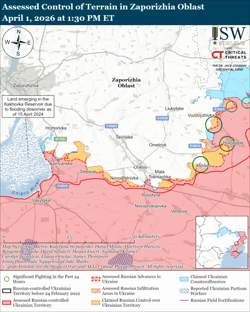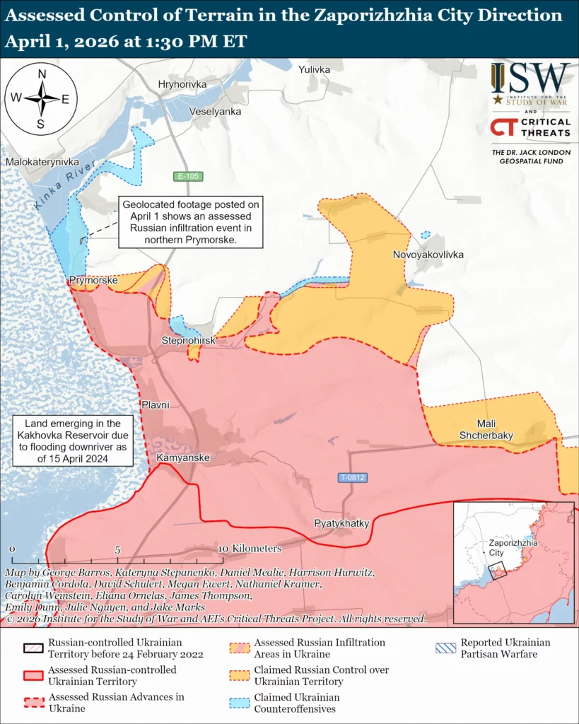 Assessed Russian infiltrations: Geolocated footage published on April 1 shows Ukrainian forces striking a Russian position in central Prymorske (northwest of Orikhiv) after what ISW assesses was a Russian infiltration mission that did not change control of terrain or the forward edge of the battle area (FEBA).[102] ISW assesses that the Russian infiltrators operating in central Prymorske likely infiltrated on a prior date.