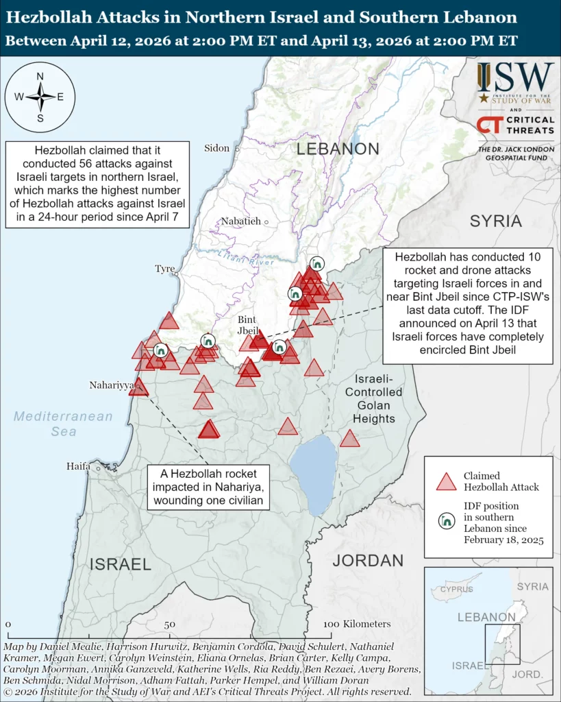 Hezbollah claimed that it has conducted 19 attacks targeting Israeli forces in southern Lebanon since CTP-ISW’s last data cutoff on April 12.[58] Hezbollah claimed 10 rocket and drone attacks targeting IDF forces in Bint Jbeil and surrounding villages amid the IDF’s isolation of and advance into Bint Jbeil on April 13.[59] An Israeli military correspondent reported that a Hezbollah drone attack wounded eight IDF personnel in southern Lebanon on April 13.[60]