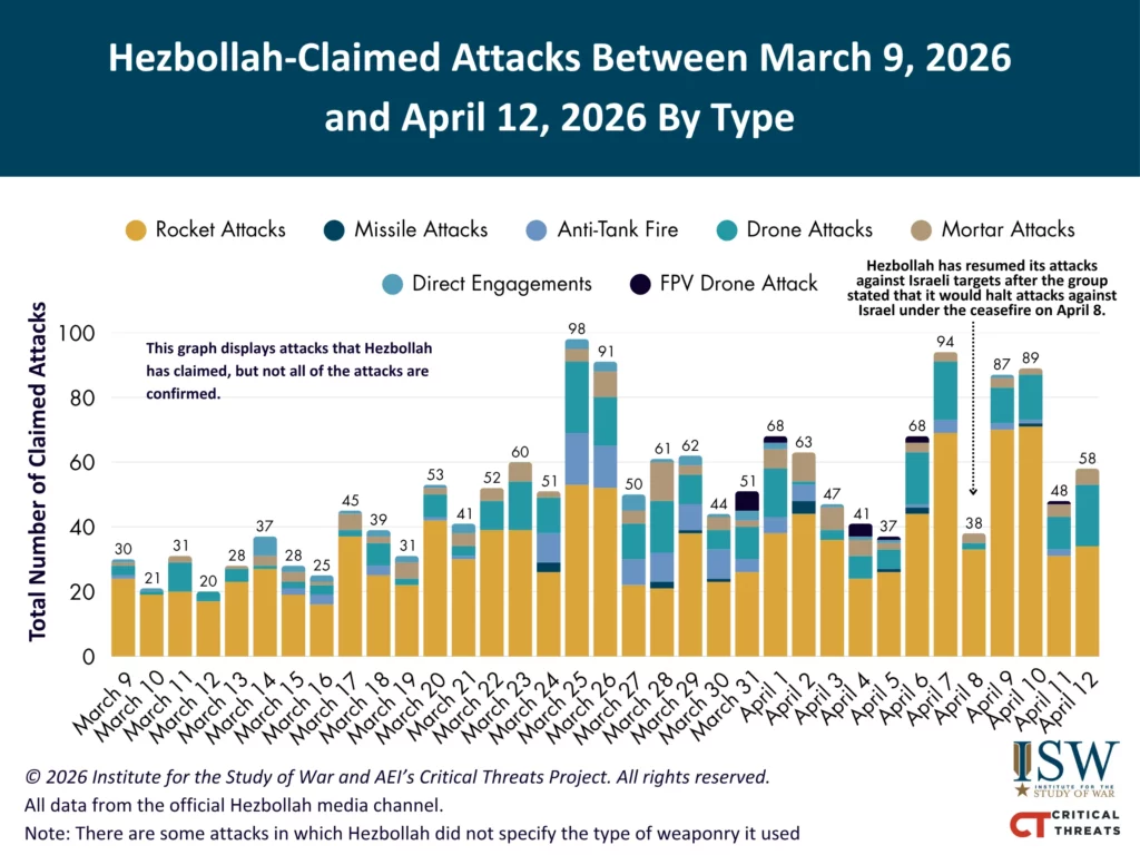 Hezbollah has sustained a high rate of drone attacks against Israeli targets since it resumed its attacks against Israeli targets on April 8 (see below). Hezbollah has claimed 22 drone attacks as of 2:00 PM ET on April 13.[61] Hezbollah previously claimed 19 drone attacks on April 12.[62] An Israeli think tank previously noted on March 23 that drones are increasingly becoming “a significant component of [Hezbollah’s] campaign.”[63] Hezbollah prioritized domestic drone production and shifted its munition rehabilitation budget to focus on drones after the Fall 2024 conflict.[64] Hezbollah has long assembled low-cost Ayoub and Mersad drones in Lebanon using civilian parts ordered online.[65]