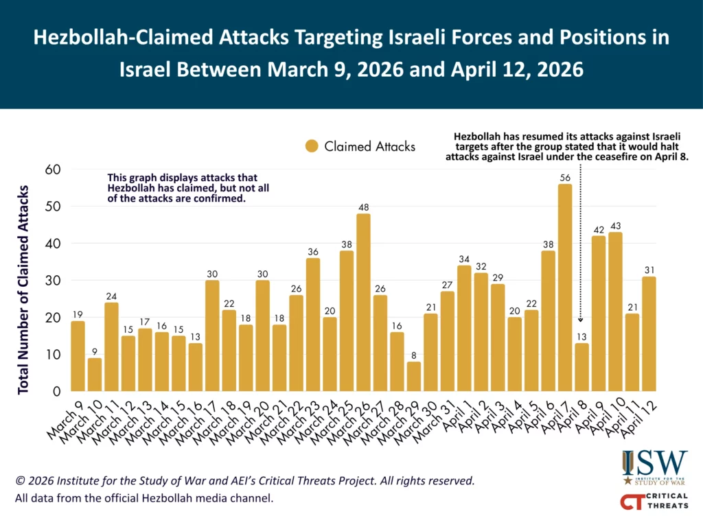 Hezbollah claimed that it has conducted 56 attacks targeting IDF infrastructure and Israeli communities in northern Israel since CTP-ISW’s last data cutoff on April 12.[51] Hezbollah has claimed 42 attacks against Israeli targets in northern Israel as of 2:00 PM ET on April 13, which is a relative increase from its claimed rate of fire targeting northern Israel on April 12 (see April 12 data in graphic below).[52] An Israeli military correspondent reported that Hezbollah launched a barrage of less than 10 rockets targeting Nahariya on April 13.[53] The correspondent reported that at least one rocket impacted in Nahariya, which wounded one civilian and caused material damage.[54] An Israeli military correspondent also reported that Hezbollah fired five rockets targeting Karmiel on April 13.[55] The correspondent reported that the IDF intercepted four of the rockets and allowed one to fall in an open area.[56] Hezbollah also claimed that it conducted seven drone and rocket attacks targeting Kiryat Shmona, which has been one of Hezbollah’s most frequent targets in northern Israel because of its proximity to the Israel-Lebanon border.[57]
