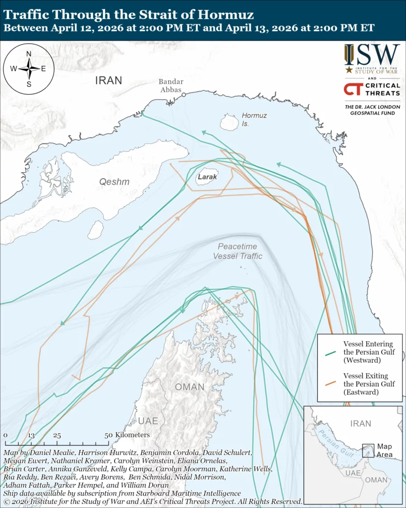 Iranian and Iranian-approved vessels continued to use the Iranian-approved transit route to cross the Strait of Hormuz before the blockade went into effect on April 13, but more vessels transited outside this route near the Omani coast than on April 12. At least two oil tankers destined for China via the Iranian-approved transit route turned around after CENTCOM began blockading Iranian and Iranian-approved shipping.