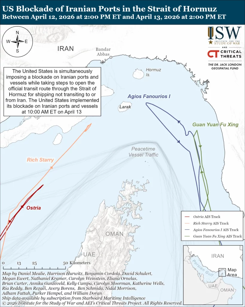 Iranian and Iranian-approved vessels continued to use the Iranian-approved transit route to cross the Strait of Hormuz before the blockade went into effect on April 13, but more vessels transited outside this route near the Omani coast than on April 12. Several Western media outlets reported that at least two Iranian-linked tankers, the Aurora and the New Future, departed the Strait of Hormuz on April 13 before CENCTOM implemented its blockade on Iranian ports and vessels.[38] Kpler and London Stock Exchange Group data indicate that the Aurora is transporting Iranian oil products, while the New Future is transporting diesel loaded from the Hamriyah Port in the United Arab Emirates (UAE) to Oman.[39] The New Future’s previous three “trades” were with Iran, according to the New York Times.[40] Commercially available shipping data also shows that at least six vessels entered the Strait of Hormuz via the Iranian-approved transit route, while at least four other vessels entered the strait outside the Iranian-approved route near the Omani coast on April 13. The shipping data further shows that at least five vessels departed the Strait of Hormuz via the Iranian-approved transit route, while one vessel departed outside the Iranian-approved route near the Omani coast on April 13. It is unclear whether the five vessels that departed the strait on April 13 are included in CENTCOM’s “limited grace period.”[41]