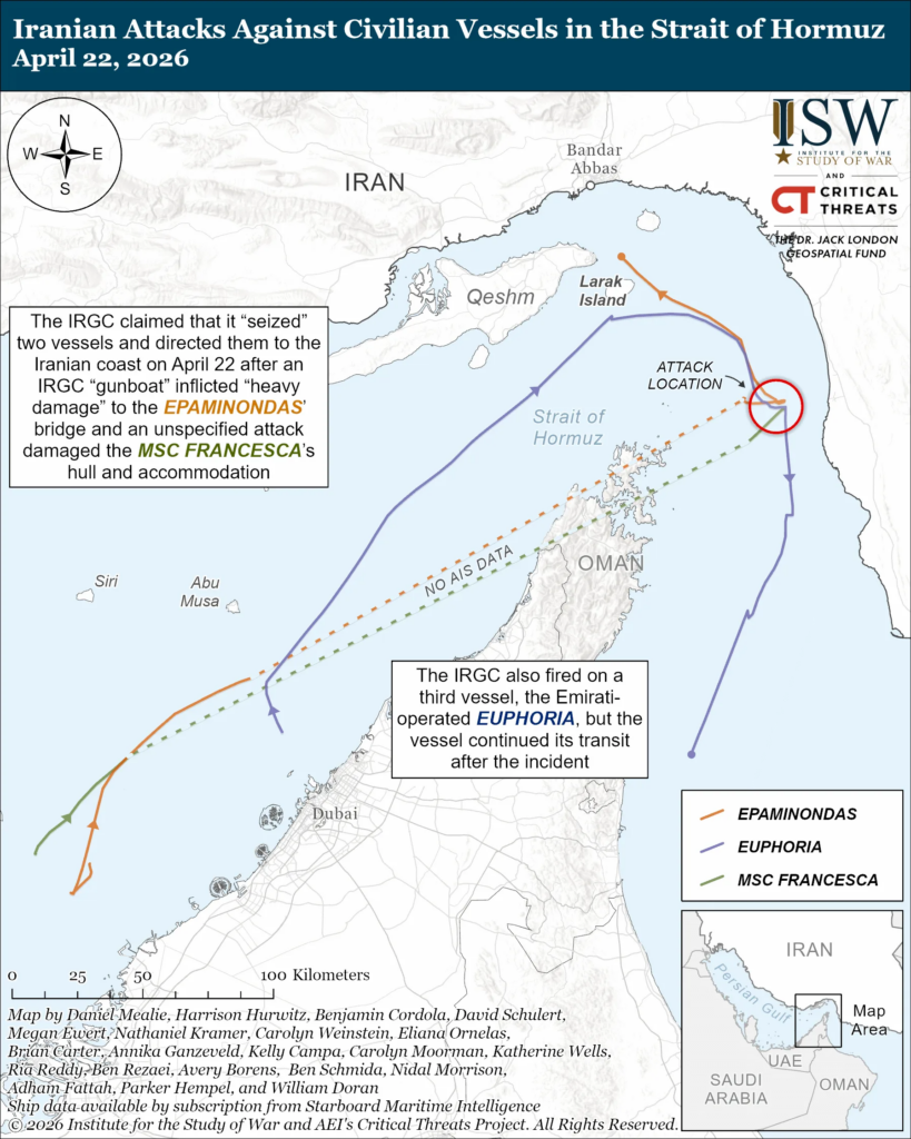 The Islamic Revolutionary Guards Corps (IRGC) Navy attacked and likely redirected two vessels towards Iran on April 22, likely to enforce Iranian claims of sovereignty over the strait to disrupt global shipping and extract US concessions. The IRGC claimed that it “seized” two vessels and directed them to the Iranian coast on April 22.[1] The two vessels — the Liberian-flagged, Greek-owned Epaminondas and the Panamanian-flagged MSC Francesca — appear to have been exiting the Strait of Hormuz at the time of the attacks.[2] An IRGC “gunboat” inflicted “heavy damage” to the Epaminondas’s bridge, and an unspecified attack damaged the MSC Francesca’s hull and accommodation.[3] Both vessels changed direction, sailed into Iranian territorial waters, and idled about seven nautical miles off the coast of Iran. Commercially available maritime tracking data showed that the Epaminondas continued to transit north in Iranian territorial waters. It is unclear why the vessels would have changed course and sailed further inland towards the Iranian coast if not under Iranian escort. The IRGC also fired on a third vessel, the Panamanian-flagged, Emirati-operated Euphoria, but the vessel continued its transit after the incident.[4] The IRGC has demanded that the United States lift its blockade over the Strait of Hormuz and effectively halted traffic through the strait on April 18 by attacking several vessels.[5] The IRGC likely aims to raise international shipping prices to extract concessions from the United States, such as ending the US blockade or yielding other demands. The IRGC also may have redirected the two vessels in response to the recent US Navy seizure of the Iranian-flagged, US-sanctioned Touska in the Gulf of Oman on April 19.[6] The Iranian regime had pledged to respond to the incident.[7]