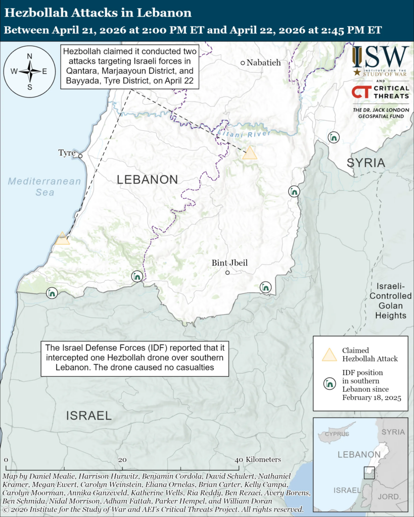 Hezbollah has continued to conduct attacks for the second consecutive day despite the Israel-Lebanon ceasefire.[37] Hezbollah claimed that it conducted two attacks targeting Israeli forces in southern Lebanon on April 22.[38] Hezbollah previously conducted two attacks on Israeli forces in southern Lebanon and northern Israel on April 21, for the first time since the Israel-Lebanon ceasefire took effect on April 16.[39] Hezbollah claimed an attack with two first-person view (FPV) drones targeting IDF personnel and a command vehicle in Qantara, Marjaayoun District.[40] The Israel Defense Forces (IDF) intercepted one Hezbollah drone over Bayyada, Tyre District, and the attacks caused no reported casualties.[41]